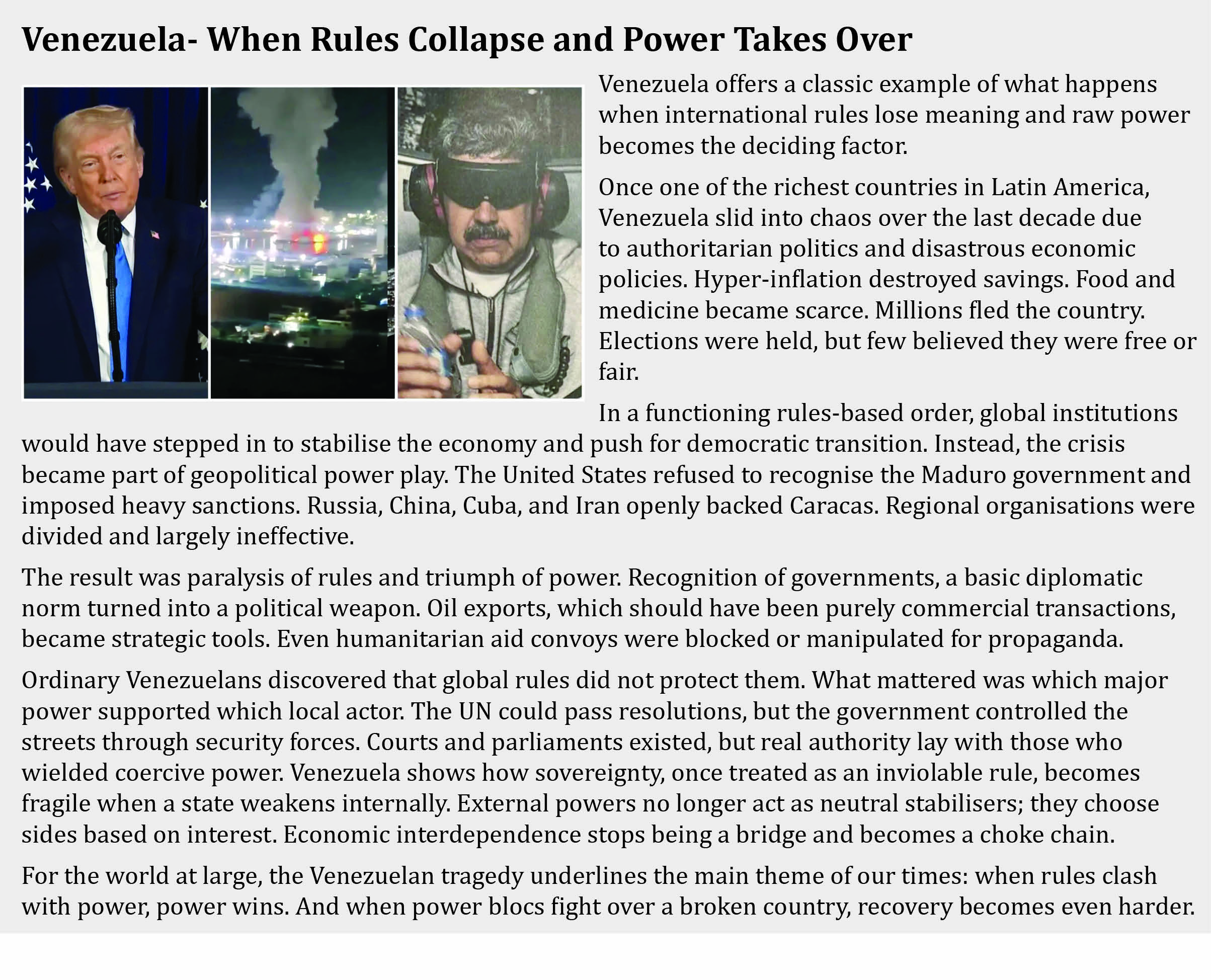 The debate should no longer be about saving the old global order. That chapter is already closing. The real question is whether countries like India can shape what comes next. Rules matter only when they are backed by strength. In today’s world, power creates space for principle, not the other way around.